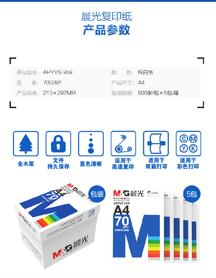 晨光(M&G)藍(lán)晨光70g A4 復(fù)印紙 500張/包  :   5包/箱(2500張) APYVS959
